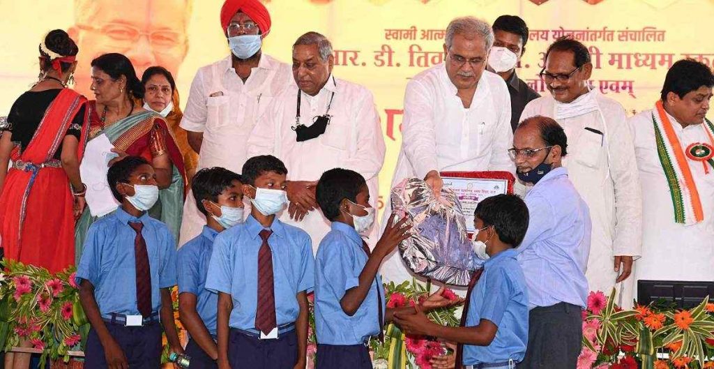 मुख्यमंत्री भूपेश बघेल ने शिक्षक दिवस के अवसर पर सभी शिक्षकों को बधाई दी। उन्होंने पूर्व राष्ट्रपति एवं भारत रत्न डॉ. सर्वपल्ली राधाकृष्णन् को नमन करते हुए कहा कि पिछले वर्ष कोरोना के कारण शिक्षक दिवस का कार्यक्रम वर्चुअल रूप से आयोजित हुआ। मुख्यमंत्री ने कहा कि आरडी तिवारी स्कूल में पहले मात्र 57 बच्चे पढ़ते थे। स्वामी आत्मानंद के नाम से अंग्रेजी माध्यम का शासकीय स्कूल प्रारंभ होने से अब यहां लगभग एक हजार बच्चे पढ़ रहे हैं। स्वामी आत्मानंद के नाम से रायपुर शहर में तीन शासकीय अंग्रेजी माध्यम स्कूल प्रारंभ किए गए, सभी वर्गाें के बच्चों के साथ यहां ऐसे बच्चों को भी प्रवेश मिला है, जो आर्थिक रूप से कमजोर परिवारों के हैं। यहां पढ़ने वाले बच्चों की फीस, पुस्तक और गणवेश का पूरा खर्चा सरकार वहन कर रही है।
