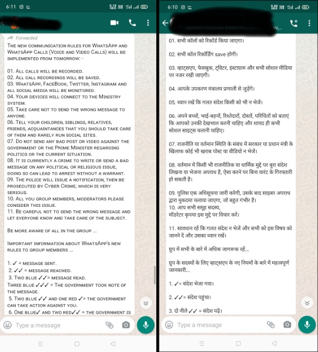 दरअसल, एक वायरल मैसेज में दावा किया जा रहा है कि भारत सरकार द्वारा अब ‘नए संचार नियम’ के तहत सोशल मीडिया और फोन कॉल की निगरानी रखी जाएगी। इस दावे पर केंद्र ने कहा कि उसने लोगों के सोशल मीडिया पोस्ट या फोन कॉल पर नजर रखने के अधिकार वाला कोई नया नियम नहीं बनाया है।