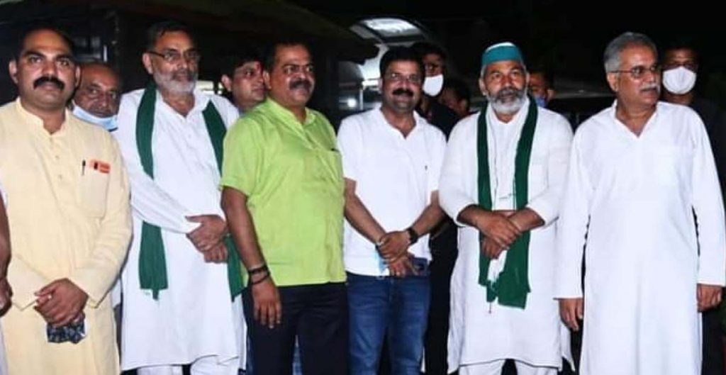 किसान नेता राकेश टिकैत, राजाराम त्रिपाठी, मेधा पाटेकर रात करीब 8 बजे मुख्यमंत्री निवास पहुंचे। इस दौरान कांग्रेस नेता आरपी सिंह, रायगढ़ विधायक प्रकाश नायक और जांजगीर-चांपा कांग्रेस अध्यक्ष चोलेश्वर चंद्राकर भी मौजूद रहे। हालांकि, मुख्यमंत्री ने राकेश टिकैत और मेधा पाटकर और दूसरे किसान नेताओं से अलग-अलग मुलाकात की।