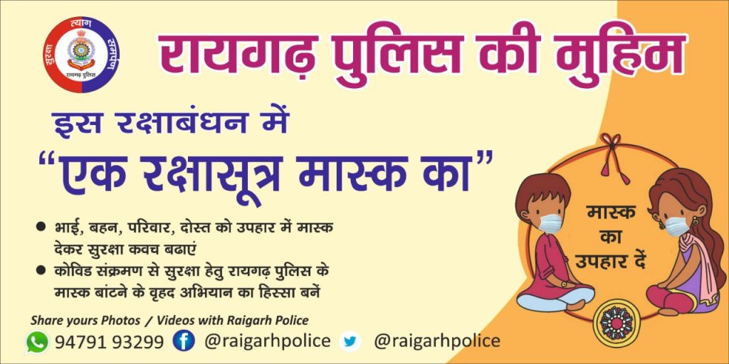 रायगढ़// कलेक्टर भीम सिंह ने कोरोना संकट के बीच रक्षा बंधन पर्व के मद्देनजर जिले के समस्त नागरिकों से अपील की है कि घर से अनावश्यक बाहर निकलने से बचे, मास्क लगाये और सोशल डिस्टेसिंग का पालन अवश्य करें। उन्होंने आगे कहा कि आज जिले में कोरोना के 18 संक्रमित मिले है। अत: आवश्यक है कि जिलेवासी कोरोना संक्रमण की चेन तोडऩे के लिये शासन-प्रशासन द्वारा जारी व प्रभावशील दिशा-निर्देशों का पूर्णत: पालन करें।