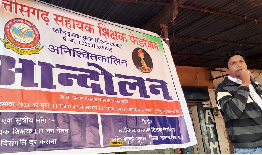 अब देखने वाली बात है की अनिश्चितकालीन आंदोलन जारी रहती है या सरकार उनकी मांगों पर जल्द ही निर्णय लेकर सौगात पेश करती है आज के विकासखंड स्तरीय आंदोलन में छत्तीसगढ़ सहायक शिक्षक फेडरेशन जिला रायगढ़ के कार्यकारी जिलाध्यक्ष विजेंद्र चौहान मीडिया प्रभारी एस कुमार सारथी प्रवक्ता अनिल देवता, हेमंत चौहान विकासखंड अध्यक्ष राजेश किसान, कार्यकारी ब्लॉक्अध्यक्ष भुवनेश्वर सिदार, उपाध्यक्ष प्रदीप प्रधान, कोषाध्यक्ष, ईश्वर चंद्र प्रधान,संरक्षक भुवनेश्वर चौहान, संगठन मत्री संदीप टोप्पो, निराकार चौहान, प्रचार मंत्री विवेक सिदार, गोविन्द माहाना, संगीत केरकेट्टा, जीवन सिदार, तरुण सिदार,चंद्र शेखर पटेल, वीरेंद्र चौहान, भरत गुप्ता महिला प्रकोष्ठ श्रीमती मधु प्रधान, दीपिका भोय, कंचन करुणा केरकेट्टा सहित अधिक संख्या में संगठन के सदस्य उपस्थित रहकर निर्धारित समय तक अपना आंदोलन जारी रखे।