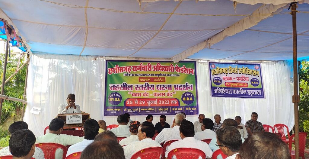 पथरिया – छत्तीसगढ़ कर्मचारी अधिकारी फेडरेशन के तत्वाधान में डीए व एचआरए की मांग को लेकर 25 जुलाई से 29 जुलाई तक पांच दिवसीय धरना प्रदर्शन का आगाज जनपद पंचायत पथरिया के प्रांगण में हुआ । ज्ञात हो कि पथरिया ब्लॉक के 1500 कर्मचारी व अधिकारी हड़ताल में है जिसमे तहसील व ब्लॉक के सभी कार्यालय के सभी अधिकारी शामिल है। अपने वक्तव्य पर कर्मचारियों ने अपनी बात रखते हुए कहा कि कांग्रेस पार्टी सत्ता में आने से पहले कर्मचारियों को हितैषी बनी हुई थी , तत्कालीन कांग्रेस अध्यक्ष भूपेश बघेल ने तो कर्मचारियों के पक्ष में छत्तीसगढ़ बन्द का आह्वान किया था और उनके प्रदेश के पदाधिकारी, जिलाध्यक्ष व ब्लॉक अध्यक्ष कर्मचारियों के समर्थन में धरना प्रदर्शन स्थल पर जाकर भाषण देते थे। आज जब वे सत्ता में है तो हम कर्मचारियों को भूल गए और स्वयं प्रताड़ित करने लगे। हद तो तब हो गई जब महंगाई भत्ता व गृह भाड़ा भत्ता को रोके रखा है जबकि हमे केंद्र सरकार के समकक्ष भत्ता मिलने का अधिकार है।पंडाल में सभी कर्मचारी संघो के नेताओ ने सरकार को कोसा और अगले चुनाव में सबक सिखाने की बात कही। इस अवसर पर छत्तीसगढ़ कर्मचारी/ अधिकारी संयोजक एवं राजपत्रित अधिकारी संघ अध्यक्ष पथरिया रामसिंह राजपूत,छत्तीसगढ प्रदेश संयुक्त शिक्षक जिला अध्यक्ष मोहन लहरी, महिला जिला अध्यक्ष नारायणी कश्यप, बलजीत सिंह कांत, शिव कौशिक ,टीचर्स असोसिएशन ब्लॉक अध्यक्ष पथरिया विश्वनाथ राजपूत , परदेशी यादव,यशवंत साहू,शालेय शिक्षक संघ ब्लॉक अध्यक्ष गुनाराम निलमर्कर, सर्व शिक्षक संघ ब्लॉक अध्यक्ष – गजानंद सिंगरौल, सहायक शिक्षक फेडरेशन ब्लॉक अध्यक्ष – इंद्राज पाटले, अशोक सोनवानी, राजस्व पटवारी संघ ब्लॉक अध्यक्ष- नरेंद्र कुमार टंडे, छत्तीसगढ शिक्षक संघ ब्लॉक अध्यक्ष- बी. पी. वर्मा, जी .एल पाटले, कृषि विस्तार अधिकारी संघ ब्लॉक अध्यक्ष- बी .पी बघेल, छत्तीसगढ़ लिपिक संघ अध्यक्ष- बी.पी. कौशिक, स्वास्थ्य कर्मचारी संघ- प्रदीप यादव, छत्तीसगढ़ तृतीय वर्ग कर्मचारी संघ- उत्तम सिंह सोलंकी, महिला एवं बालविकास अध्यक्ष- चंद्रिका कुर्रे, व्यायाम शिक्षक संघ- रीना चंद्रवंशी, अशोक यादव, लघुवेतन कर्मचारी संघ- बिहारी लाल पहारे, व्याख्याता संघ ब्लॉक अध्यक्ष- रामाधार कर्मकार, शैक्षिक समन्वयक संघ ब्लॉक अध्यक्ष – मोहित खण्डेय , शा. अ.ज.जा. संघ ब्लॉक अध्यक्ष- शैलेन्द्र ध्रुव,अनियमित कर्मचारी संघ – प्रिया यादव सहित सैकड़ों अधिकारी कर्मचारी खराब मौसम में डटे रहे।