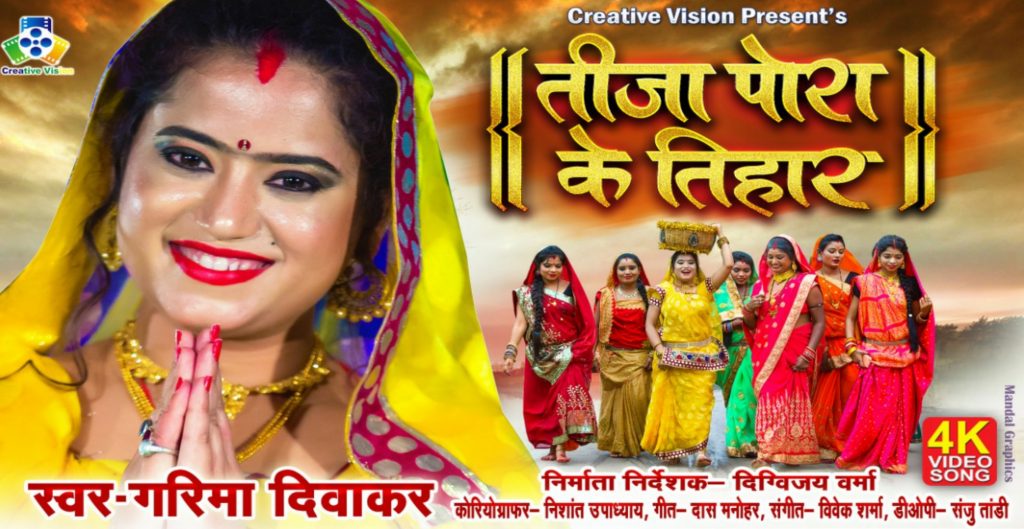 इसी कड़ी में गरिमा दिवाकर का भी तीजा पोरा (तीजा पोला) का गाना क्रिएटिव विज़न के यू ट्यूब चैनल में रिलीस हुआ है, जो की इस साल का सबसे बढ़िया तीजा सांग है.