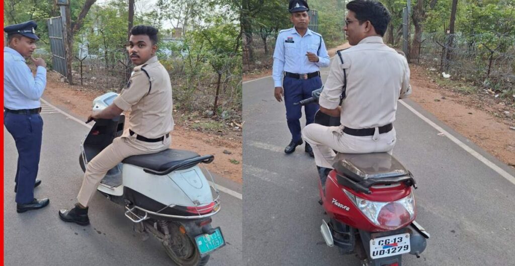 रायगढ़// यातायात नियमों की सख्ती से पालन को लेकर पुलिस प्रशासन ने खुद अपने विभाग में अनुशासन की मिसाल पेश की है। हाल ही में पुलिस अधीक्षक दिव्यांग पटेल के निर्देश पर एक विशेष अभियान चलाया गया, जिसमें पुलिसकर्मियों के हेलमेट पहनने की स्थिति की जांच की गई। इस दौरान रक्षित केंद्र और पुलिस कार्यालय परिसर में 10 पुलिसकर्मी ऐसे पाए गए जो बिना हेलमेट दुपहिया वाहन चला रहे थे। इन सभी पर मोटर व्हीकल एक्ट के अंतर्गत कार्रवाई करते हुए 500-500 रुपये का चालान काटा गया।