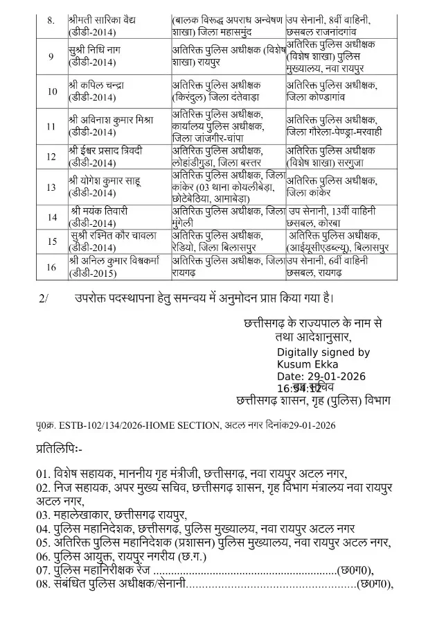 रायपुर// प्रमोशन के बाद एडिश्नल एसपी रैंक के अधिकारियों को नयी पोस्टिंग दी गयी है। पिछले साल 10 दिसंबर को हुई डीपीसी के आधार पर 30 दिसंबर को राज्य पुलिस सेवा के 16 अफसरों को पदोन्नति दी गयी थी। अब पदोन्नत एडिश्नल एसपी को पोस्टिंग दे दी गयी है।