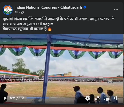 इस घटना को लेकर छत्तीसगढ़ काँग्रेस कॉमेटी ने अपने आधिकारिक फेसबूक मे विडिओ शेयर करते हुए लिखा कि “गृहमंत्री विजय शर्मा के कवर्धा में आजादी के पर्व पर भी बवाल.. कानून व्यवस्था के साथ साथ अब अनुशासन भी बदहाल, बैकग्राउंड म्यूजिक भी कमाल है..”