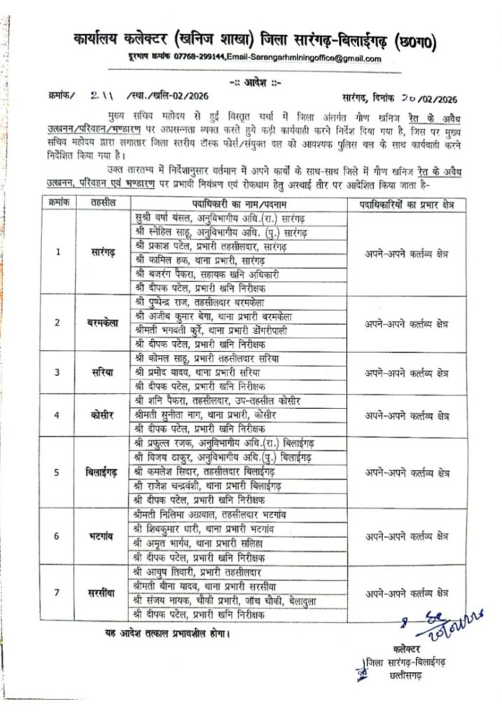 इस तारतम्य में कलेक्टर डॉ संजय कन्नौजे ने बीते शुक्रवार को सम्पूर्ण जिला-सारंगढ़ बिलाईगढ़ में अधिकारियों के प्रभार क्षेत्र में अपने कर्तव्यों के साथ – साथ जिले में गौण खनिज रेत के अवैध उत्खनन, परिवहन, भण्डारण पर प्रभावी नियंत्रण एवं रोकथाम हेतु अस्थाई तौर पर आदेश जारी किया है।
