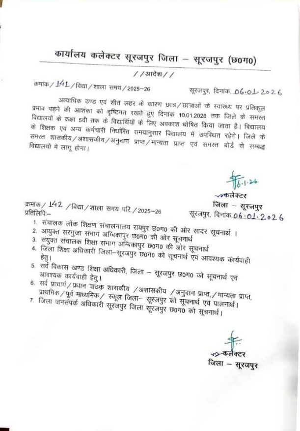 रायपुर// कड़ाके की ठंड के अलर्ट के बीच स्कूलों के बंद होने का सिलसिला भी जारी है। पहले बलरामपुर, फिर सरगुजा के बाद एक और जिले में ठंड की वजह से स्कूल बंद करने का आदेश जारी हुआ है। सरगुजा संभाग के सूरजपुर जिले में भी 10 जनवरी तक स्कूलों को बंद कर दिया गया है। हालांकि शिक्षकों के लिए छुट्टी नहीं होगी। ये आदेश पहली से लेकर 5वीं तक के बच्चों पर लागू होगी।