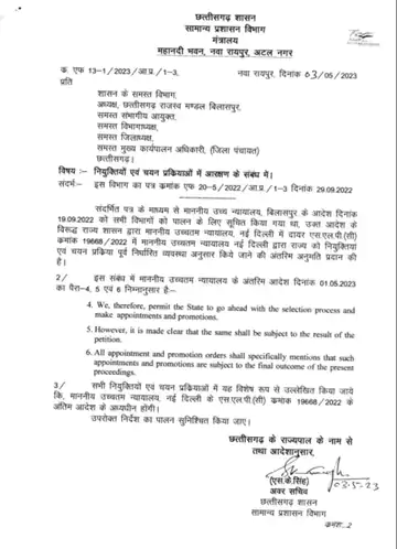 सुप्रीम कोर्ट द्वारा छत्तीसगढ़ में 58 फीसदी आरक्षण पर लगी रोक हटाए जाने के बाद मुख्यमंत्री भूपेश बघेल ने हाई लेवल मीटिंग लेकर प्रदेश में जल्द ही बड़े पैमाने पर सरकारी नौकरियों में भर्ती और प्रमोशन के निर्देश दिए थे। जिसके बाद सामान्य प्रशासन विभाग ने ये आदेश जारी किया है।