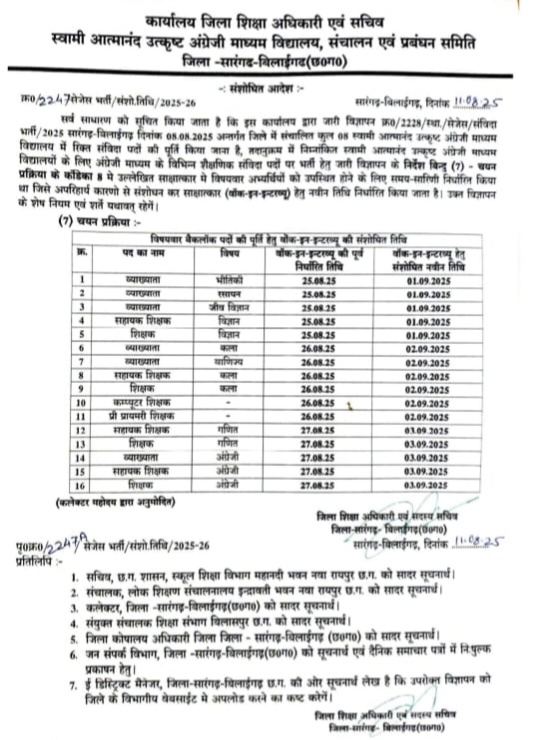 सारंगढ़ बिलाईगढ़// कार्यालय जिला शिक्षा अधिकारी एवं सचिव स्वामी आत्मानंद उत्कृष्ट अंग्रेजी माध्यम विद्यालय संचालन एवं प्रबंधन समिति जिला सारंगढ़ बिलाईगढ़ द्वारा वॉक इन इंटरव्यू के माध्यम से 36 पदों के लिए संविदा भर्ती विज्ञापन जारी किया गया है, जिसके तिथि में संशोधन किया गया है। यह जिले की वेबसाइट सारंगढ़ बिलाईगढ़ डॉट सीजी डॉट जीओवी डॉट इन पर उपलब्ध है। वॉक इन इंटरव्यू 25, 26 अगस्त और 27 अगस्त 2025 के स्थान पर अब संशोधित तिथि 1, 2 और 3 सितंबर निर्धारित है।