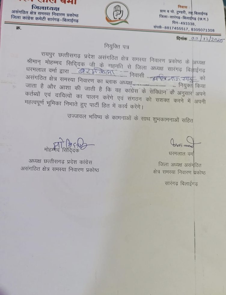 नियुक्ति पत्र के अनुसार छत्तीसगढ़ प्रदेश असंगठित क्षेत्र समस्या निवारण प्रकोष्ठ के अध्यक्ष मोहम्मद सिद्दिक की सहमति से जिला अध्यक्ष सारंगढ़ बिलाईगढ़ धरमलाल वर्मा ने बरमकेला निवासी अविनाश साहू को यह जिम्मेदारी सौंपी है। नियुक्ति के साथ ही उन्हें कांग्रेस के संविधान के अनुरूप अपने कर्तव्यों और दायित्वों का निर्वहन करने तथा संगठन को जमीनी स्तर पर सशक्त बनाने की जिम्मेदारी दी गई है।