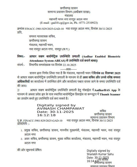 रायपुर// सरकारी दफ्तरों में बैठकर मनमानी करने और ड्यूटी पर देर से आने वाले लापरवाह अफसरों और कर्मचारियों की अब खैर नहीं होगी। सामान्य प्रशासन विभाग (जीएडी) ने एक कड़ा फरमान जारी किया है, जिसके तहत मंत्रालय और संचालनालयों में आधार आधारित बायोमेट्रिक अटेंडेंस अनिवार्य कर दी गई है। यह व्यवस्था 1 दिसंबर से शुरू हो रही है, जिसका सीधा मतलब है कि अब समय पर नहीं आने वालों पर सख्त कार्रवाई होगी और उनकी मनमर्ज़ी खत्म हो जाएगी।