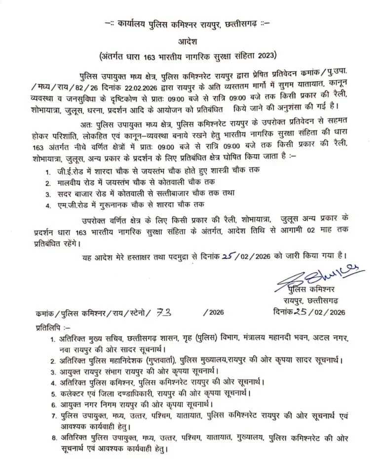 रायपुर// राजधानी रायपुर में यातायात व्यवस्था को सुचारु रखने और कानून-व्यवस्था बनाए रखने के उद्देश्य से पुलिस प्रशासन ने महत्वपूर्ण कदम उठाया है। पुलिस उपायुक्त, मध्य क्षेत्र द्वारा प्रस्तुत प्रतिवेदन के आधार पर पुलिस कमिश्नर ने भारतीय नागरिक सुरक्षा संहिता की धारा 163 के अंतर्गत शहर के अति व्यस्ततम मार्गों पर रैली, शोभायात्रा, जुलूस, धरना और अन्य प्रकार के प्रदर्शनों पर प्रतिबंध लागू कर दिया है।