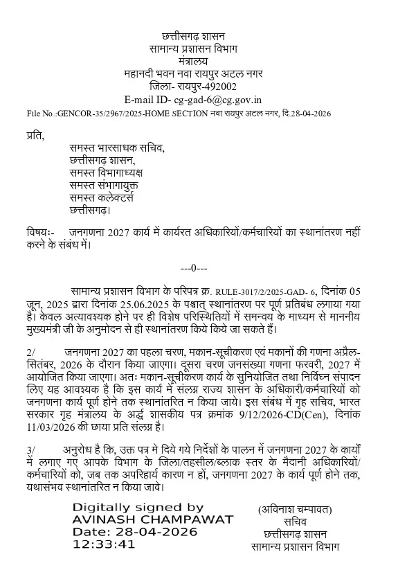 इस संबंध में केंद्र सरकार के गृह मंत्रालय की ओर से भी निर्देश जारी किए गए हैं। सचिव द्वारा 11 मार्च 2026 को जारी अर्द्धशासकीय पत्र में भी यही सुझाव दिया गया है कि जनगणना कार्य में लगे कर्मचारियों को कार्य पूर्ण होने तक यथासंभव स्थानांतरित न किया जाए।
