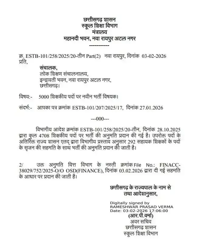 रायपुर// छत्तीसगढ़ स्कूल शिक्षा विभाग ने शिक्षक भर्ती को लेकर नया आदेश जारी किया है। अब राज्य में 5,000 शिक्षकीय पदों पर भर्ती की अनुमति मिल गई है। इससे पहले 4,708 पदों की ही भर्ती की मंजूरी थी, लेकिन सहायक शिक्षकों के 292 पदों के सृजन के साथ पूरे 5,000 पदों पर भर्ती का रास्ता साफ हो गया है।