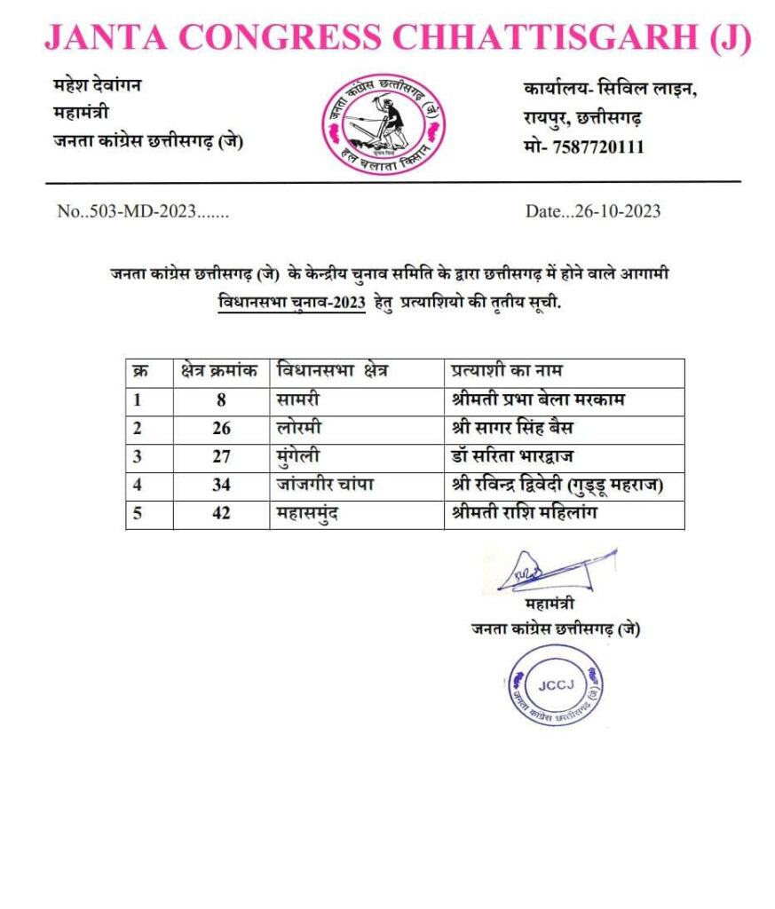 बड़ी खबर : छत्तीसगढ़ विधानसभा चुनाव 2023 : JCCJ की तीसरी लिस्ट जारी, लोरमी से सागर सिंह बैस को तो मुंगेली से सरिता भारद्वाजमिला टिकट..