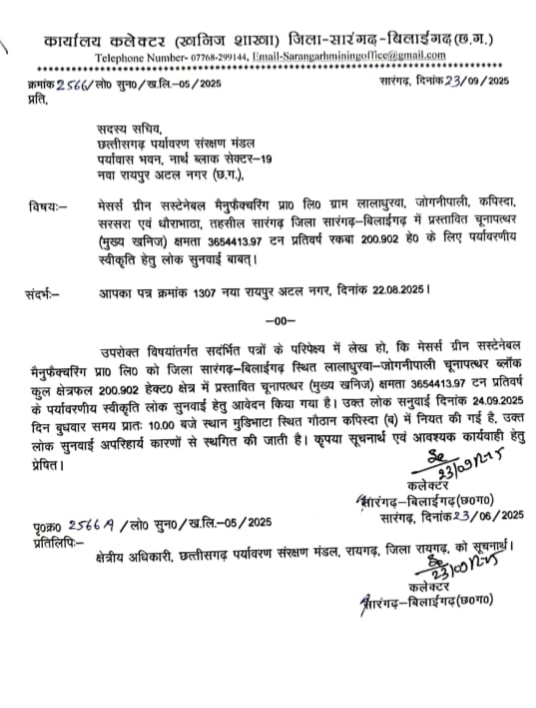 सारंगढ़-बिलाईगढ़// ग्रीन सस्टेबल मैन्युफैक्चरिंग प्रा. लि. कंपनी द्वारा प्रस्तावित ओपन खदान परियोजना को लेकर ग्रामीणों और जनप्रतिनिधियों का विरोध लगातार जारी है। लंबे समय से चल रहे इस विरोध आंदोलन का असर अब दिखने लगा है। इसी कड़ी में 24 सितंबर को ग्राम लालाधुरवा कपीसदा में होने वाली जनसुनवाई को प्रशासन ने स्थगित कर दिया है।