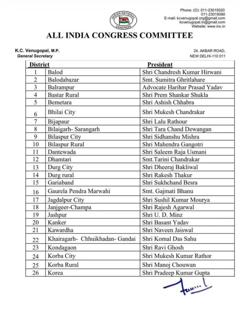 बालोद में चंद्रेश कुमार हिरवानी, बलौदाबाजार में सुमित्रा घृतलहरे, बलरामपुर में हरिहर प्रसाद यादव और बस्तर ग्रामीण के लिए प्रेम शंकर शुक्ला को जिलाध्यक्ष नियुक्त किया गया है। दंतेवाड़ा में सलीम राजा उस्मान, धमतरी में तारिणी चंद्राकर, दुर्ग शहर में धीरज बाकलीवाल, कोंडागांव में रवि घोष और कोरबा शहर में मुकेश कुमार राठौर को जिम्मेदारी मिली है।