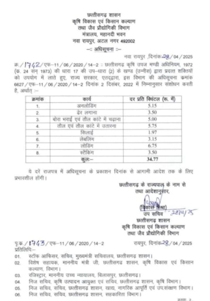 महानदी भवन मंत्रालय से कृषि विकास एवं किसान कल्याण विभाग ने अधिसूचना जारी करते हुए ‘लोडिंग से लेकर स्टैकिंग’ तक के 8 प्रमुख कामों की दरें निर्धारित कर दी हैं। अब मंडी में एक क्विंटल उपज के निस्तारण का कुल खर्च 34.77 रुपये तय किया गया है।