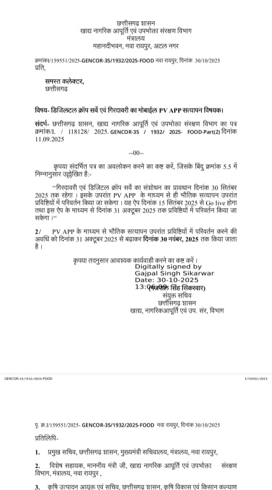 बता दें कि इस संबंध में खाद्य, नागरिक आपूर्ति एवं उपभोक्ता संरक्षण विभाग द्वारा सभी कलेक्टरों को पत्र जारी किया गया है। विभाग ने पत्र में अपने 11 सितंबर 2025 के आदेश का संदर्भ देते हुए बताया कि पूर्व में यह प्रावधान किया गया था कि गिरदावरी एवं डिजिटल क्रॉप सर्वे के संशोधन की अंतिम तिथि 30 सितंबर 2025 तक रहेगी। इसके बाद केवल PV ऐप के माध्यम से भौतिक सत्यापन के बाद ही प्रविष्टियों में संशोधन किया जा सकेगा। यह ऐप 15 सितंबर 2025 से Go Live किया गया था, जिसके माध्यम से 31 अक्टूबर 2025 तक प्रविष्टियों में बदलाव करने की अनुमति थी।