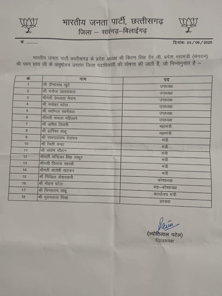 सारंगढ़-बिलाईगढ़// भारतीय जनता पार्टी ने आज सारंगढ़-बिलाईगढ़ जिले के लिए अपने नवनियुक्त जिला पदाधिकारियों की घोषणा की। पार्टी प्रदेश अध्यक्ष किरण सिंह देव और प्रदेश महामंत्री (संगठन) पवन साय की अनुमति से जारी सूची में 18 नाम शामिल किए गए हैं।