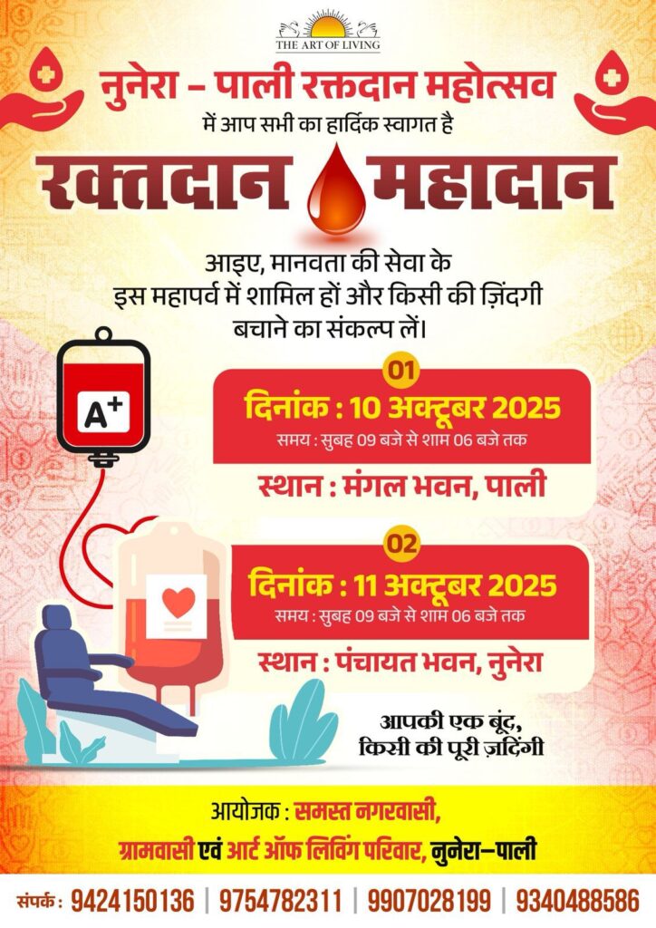 कोरबा// द आर्ट ऑफ़ लिविंग परिवार पाली के तत्वाधान में 10 अक्टूबर को नगर पंचायत पाली के मंगल भवन में विशाल स्वैच्छिक रक्तदान शिविर का आयोजन किया गया है। आयोजक समिति के संयोजक संतोष भावनानी एवं विशाल मोटवानी ने बताया कि यह शिविर प्रत्येक वर्ष आयोजित किया जाता है। इसे लेकर क्षेत्र के युवा रक्तदाताओं में काफी उत्साह है। भावनानी के अनुसार स्वस्थ्य और युवा लोगों के लिए रक्तदान से कोई नुकसान नहीं है। इसे लेकर भ्रांतियां है, जिसे लेकर ज़न जागरुकता अभियान भी चलाया जा रहा है।