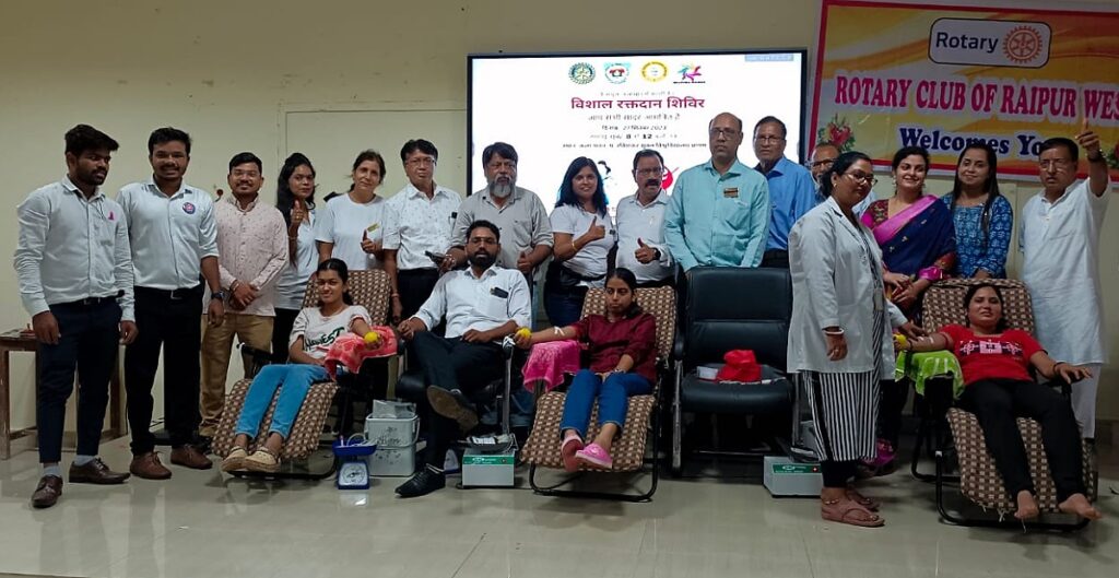 रायपुर //कला भवन, पं. रविशंकर शुक्ल विश्वविद्यालय परिसर में रक्तदान शिविर का आयोजन किया गया था जिसमें 79 यूनिट ब्लड एकत्रित किया गया जो कि सिकलीन एवं थैलेसिमिया के मरीजों सहित बाकी जरूरतमंद मरीजों को उपलब्ध कराया जायेगा बता दें कि रायपुर में विभिन्न प्रकार की संस्थाएं लगातार रक्तदान एवं समाज सेवा के क्षेत्र में कार्य कर रही है ऐसे परिस्थिति में जहां मरीजों को हॉस्पिटल मे एडमिट होने के बाद रक्त सम्बन्धी आवश्यकता के लिए काफी परेशानियों का सामना करना पड़ता है जिस वक्त परिवार के लोग भी रक्तदान करने हेतु साथ नहीं देते ऐसे परिस्थिति में रक्तदान कराने वाली संस्थाएं निः स्वार्थ रूप से जरूरतमंदों को रक्त उपलब्ध कराती है, जिनमें हेल्पिंग हैंड्स क्लब रायपुर सहित अन्य जगहों पर सबसे सक्रिय संस्था के तौर पर दिन रात एक करके मरीजों की मदद कर रही है एवं विभिन्न सहयोगी संस्थाओं के साथ समय समय पर रक्तदान शिविर का आयोजन कर लोगों को हर संभव सहायता पहुंचा रही है