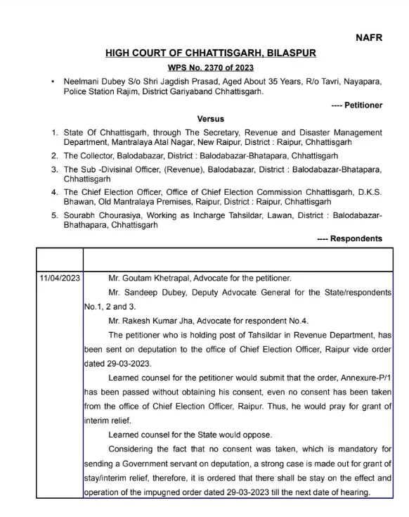उल्लेखनीय है कि, बलौदाबाजार जिले के पलारी तहसीलदार नीलमणि दुबे का प्रतिनियुक्ति पर 29 मार्च को सिंगल आदेश निकालकर तबादला कर दिया गया था। तहसीलदार नीलमणि दुबे, डिप्टी कलेक्टर अंशुल वर्मा और आरआई प्रीतम चंद्राकर की टीम ने 29 मार्च को अवैध रेत उत्खनन कर ले जा रहे ट्रक को पकड़ा था। इस पर कार्रवाई करने से विधायक शकुंतला साहू नाराज हो गई थी। कार्रवाई के कुछ ही घंटों बाद ही राजस्व व आपदा प्रबंधन विभाग ने सिंगल आदेश निकालकर तहसीलदार नीलमणि दुबे को मुख्य निर्वाचन पदाधिकारी कार्यालय रायपुर में प्रतिनियुक्ति पर भेज दिया था। इसके बाद तहसीलदार नीलमणि दुबे ने अपने अधिवक्ता के माध्यम से उच्च न्यायालय बिलासपुर में याचिका दायर की थी, जिस पर हाईकोर्ट ने तहसीलदार के स्थानांतरण पर स्टे लगा दिया है।