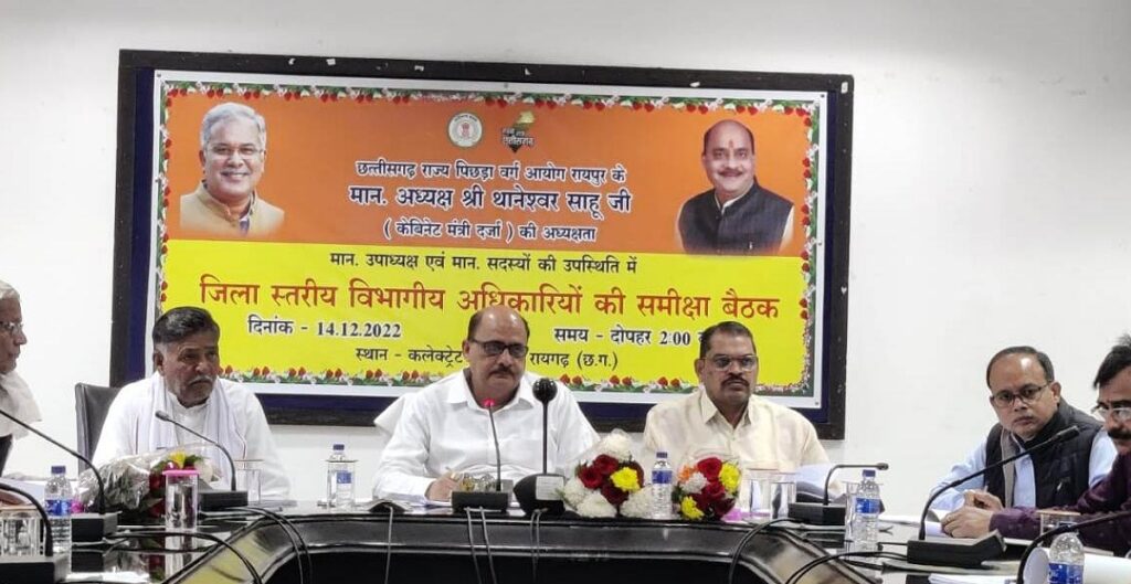 रायगढ़/ छ.ग.राज्य पिछड़ा वर्ग आयोग के अध्यक्ष (केबिनेट मंत्री दर्जा) थानेश्वर साहू ने कलेक्टोरेट सभाकक्ष में जिला स्तरीय अधिकारियों की समीक्षा बैठक ली। इस दौरान सदस्य महेश चंद्रवंशी, साधुचरण यादव एवं सचिव बीरू कुमार साहू, जिला पंचायत अध्यक्ष निराकार पटेल, सीईओ जिला पंचायत अबिनाश मिश्रा भी उपस्थित रहे।