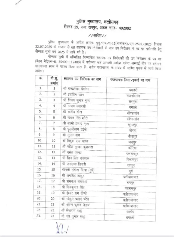 रायपुर// छत्तीसगढ़ पुलिस महकमे में बड़ा बदलाव किया गया है। डीजीपी अरुणदेव गौतम ने राज्य के 31 सहायक उपनिरीक्षकों (ASI) को सब इंस्पेक्टर (SI) पदोन्नत करने का आदेश जारी किया है।