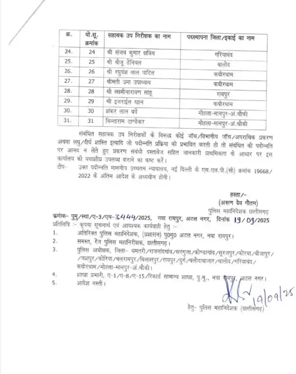 पदोन्नति पाने वाले सभी 31 सब इंस्पेक्टरों को फिलहाल वर्तमान पदस्थापना पर ही रखा गया है। हालांकि, इनके ट्रांसफर और नई पदस्थापना की सूची बाद में जारी की जाएगी।