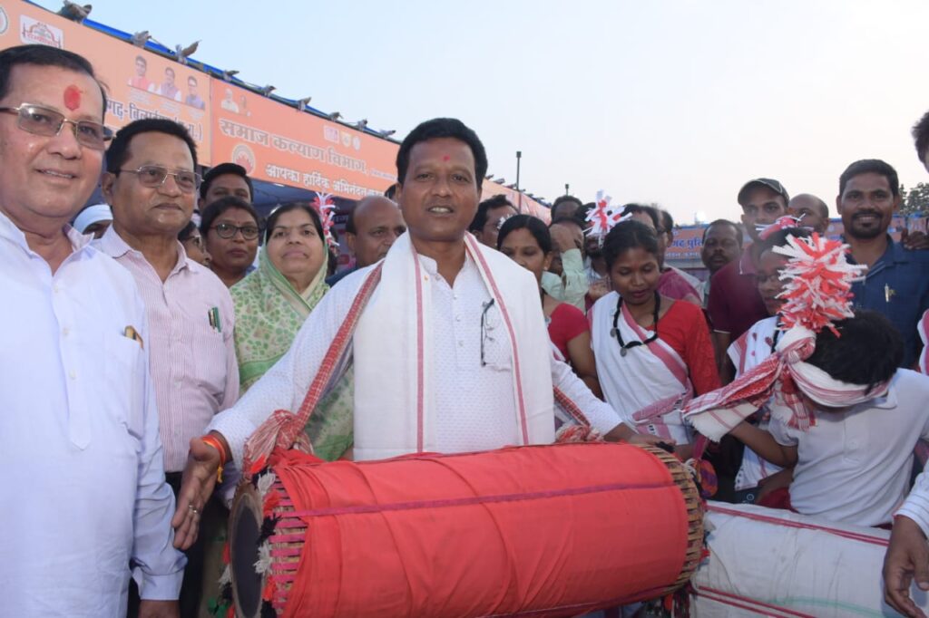 मुख्य अतिथि राठिया ने देवगुड़ी में पूजा और मांदर की थाप हाथों में लिया