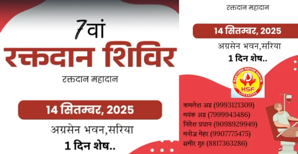 सारंगढ़-बिलाईगढ़// रक्तवीर परिवार सरिया के तत्वावधान में नगर पंचायत सरिया के अग्रसेन भवन में आगामी 14 सितंबर यानि कल सातवां विशाल रक्तदान शिविर आयोजित किया जाएगा। इस शिविर को लेकर नगर और आसपास के क्षेत्रों में उत्साह का माहौल है। अब तक 300 से अधिक रक्तदाताओं ने पंजीयन कराया है और आयोजकों का लक्ष्य 400 से अधिक यूनिट रक्त संग्रह करने का है।