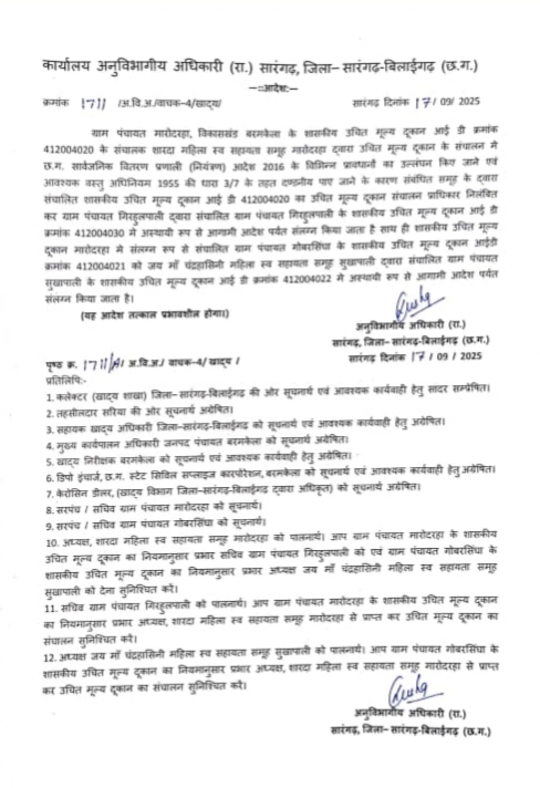 सारंगढ़ बिलाईगढ़// बरमकेला जनपद के ग्राम पंचायत मारोदरहा की उचित मूल्य दुकान में गड़बड़ी और राशन घोटाले के बाद प्रशासन ने कार्रवाई तो की, लेकिन जमीनी स्तर पर लापरवाही अब भी चरम पर है। एसडीएम सारंगढ़ के स्पष्ट और सख्त निर्देश के बावजूद नई समिति को आज तक प्रभार नहीं सौंपा जा सका।