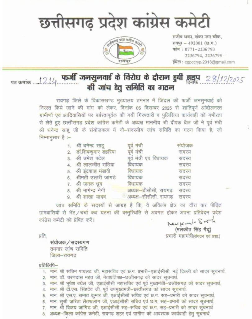 कांग्रेस की यह समिति तमनार के प्रभावित क्षेत्रों का दौरा कर स्थानीय लोगों से चर्चा करेगी और घटनाक्रम की वस्तुस्थिति का आकलन करेगी। इसके बाद समिति अपनी विस्तृत जांच रिपोर्ट पार्टी नेतृत्व को सौंपेगी।