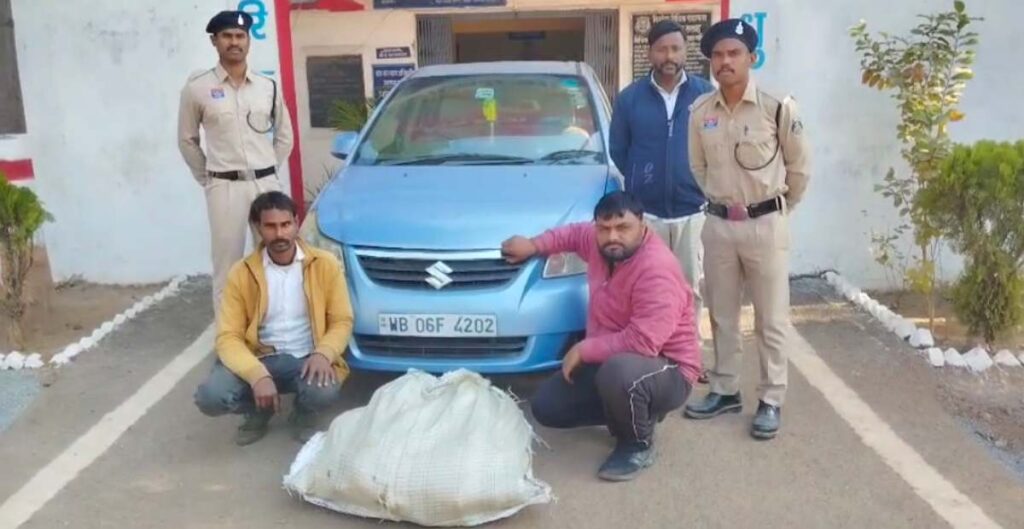 कार की तलाशी लेने पर सफेद प्लास्टिक की बोरियों में भरे 25 पैकेट गांजा बरामद किए गए। कुल वजन 25 किलो 935 ग्राम निकला। कार में सवार आरोपियों ने पूछताछ में अपने नाम शीतल प्रकाश पाठक निवासी झांसी उत्तरप्रदेश और कल्लू केवट निवासी कटनी मध्यप्रदेश बताए। पूछताछ में आरोपियों ने गांजा सोनपुर उड़ीसा से लाकर कटनी और झांसी की ओर बिक्री के लिए ले जाना स्वीकार किया।