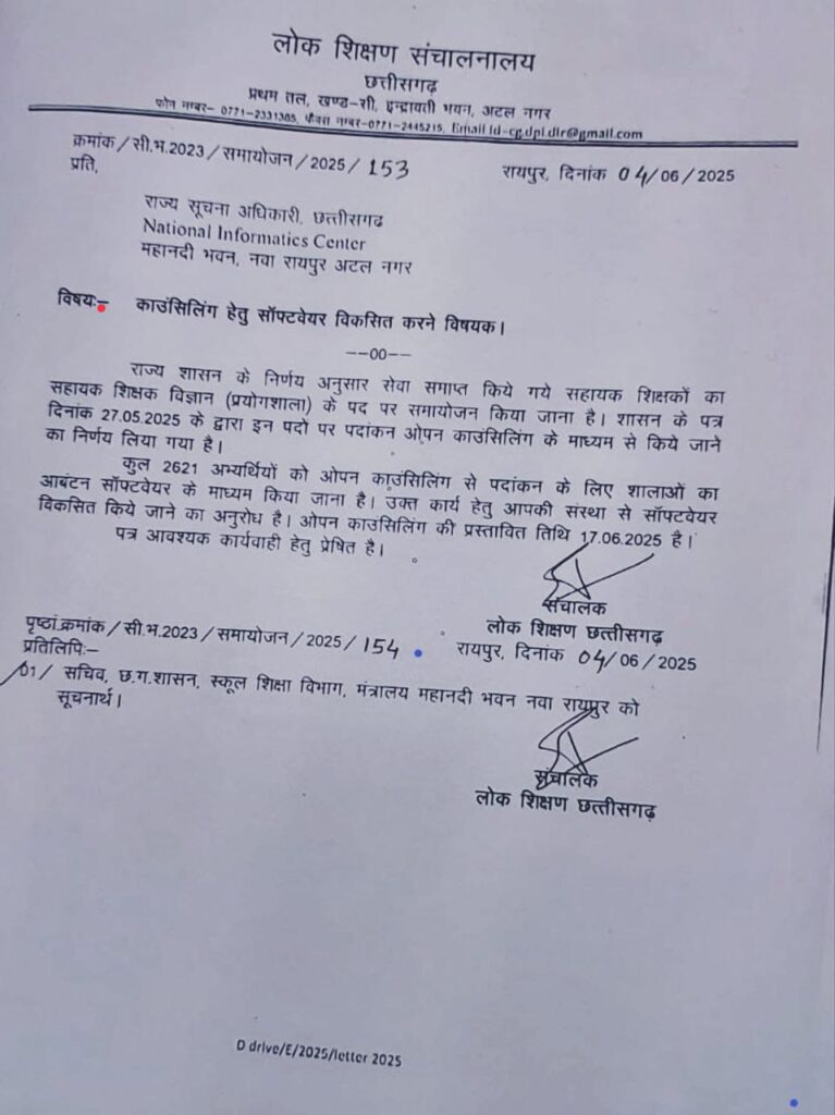 इस सबंध में राज्य सरकार की तरफ से 27 मई को डीपीआई को पत्र भेजा गया है, जिसमें काउंसिलिंग के जरिये पदांकन कराने का निर्णय लिया गया है। आदेश के मुताबिक कुल 2621 शिक्षकों को ओपन काउंसिलिंग के जरिये पदांकन मिलना है। ऐसे में साफ्टवेयर के जरिये काउंसिलिंग की प्रक्रिया पूरी होगी। डीपीआई के आदेश के मुताबिक 17 जून से सहायक शिक्षक विज्ञान प्रयोगशाला के लिए काउंसिलिंग शुरू हो सकती है।