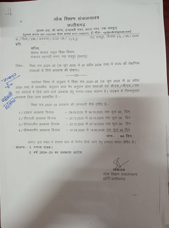 रायपुर// दशहरा, दीपावली, शीतकालीनी व ग्रीष्मकालीन अवकाश मिलाकर इस बार कुल 64 दिन की छुट्टी रहेगी। शिक्षा विभाग की तरफ से इस संबंध में औपचारिक आदेश तो नहीं आया है, लेकिन सूत्रों के मुताबिक डीपीआई के प्रस्ताव पर शिक्षा विभाग ने मुहर लगा दी है। दरअसल 14 अगस्त को डीपीआई की तरफ से शिक्षा सचिव को प्रस्ताव भेजा गया था।