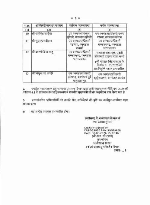 रायपुर// राजधानी रायपुर से बड़ी प्रशासनिक खबर सामने आई है। वन एवं जलवायु परिवर्तन विभाग ने सहायक वन संरक्षक स्तर के 13 अधिकारियों की ट्रांसफर लिस्ट जारी कर दी है। लिस्ट जारी होते ही विभाग में हलचल तेज हो गई है, क्योंकि कई अहम वनमंडलों में अफसरों की अदला-बदली की गई है।