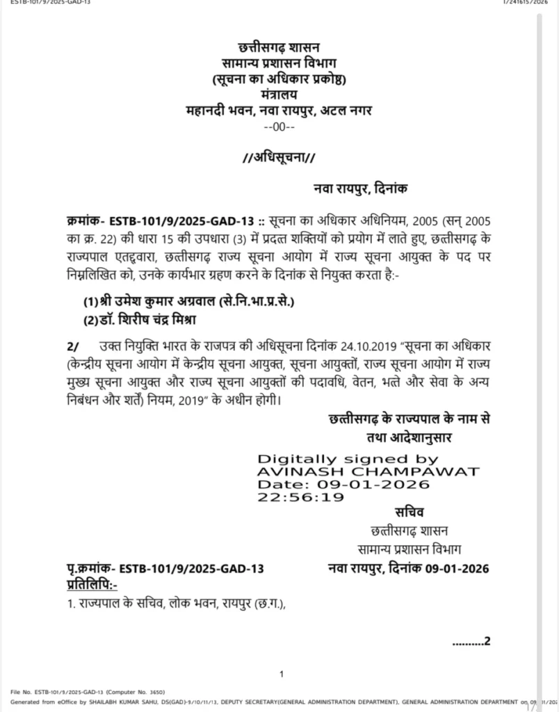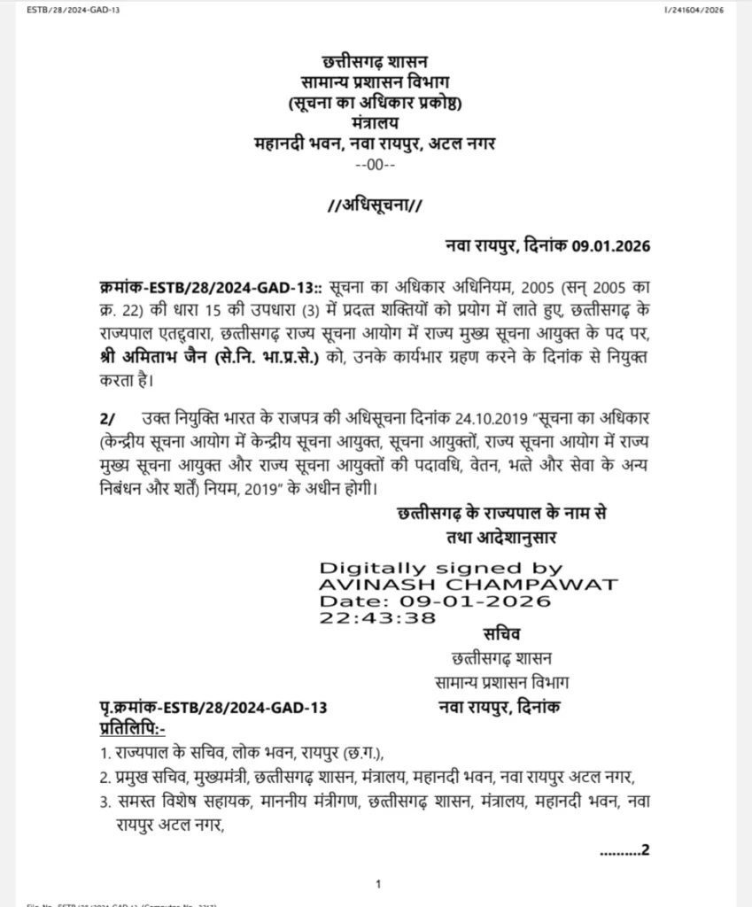 रायपुर// लंबे इंतजार के बाद आखिरकार सूचना आयोग में नियुक्ति हो गई है। रिटायर्ड मुख्य सचिव अमिताभ जैन को मुख्य सूचना आयुक्त बनाया गया है। वही, रिटायर्ड IAS उमेश अग्रवाल और वरिष्ठ पत्रकार शिरीष चंद्र मिश्रा को राज्य सूचना आयुक्त बनाया गया है।