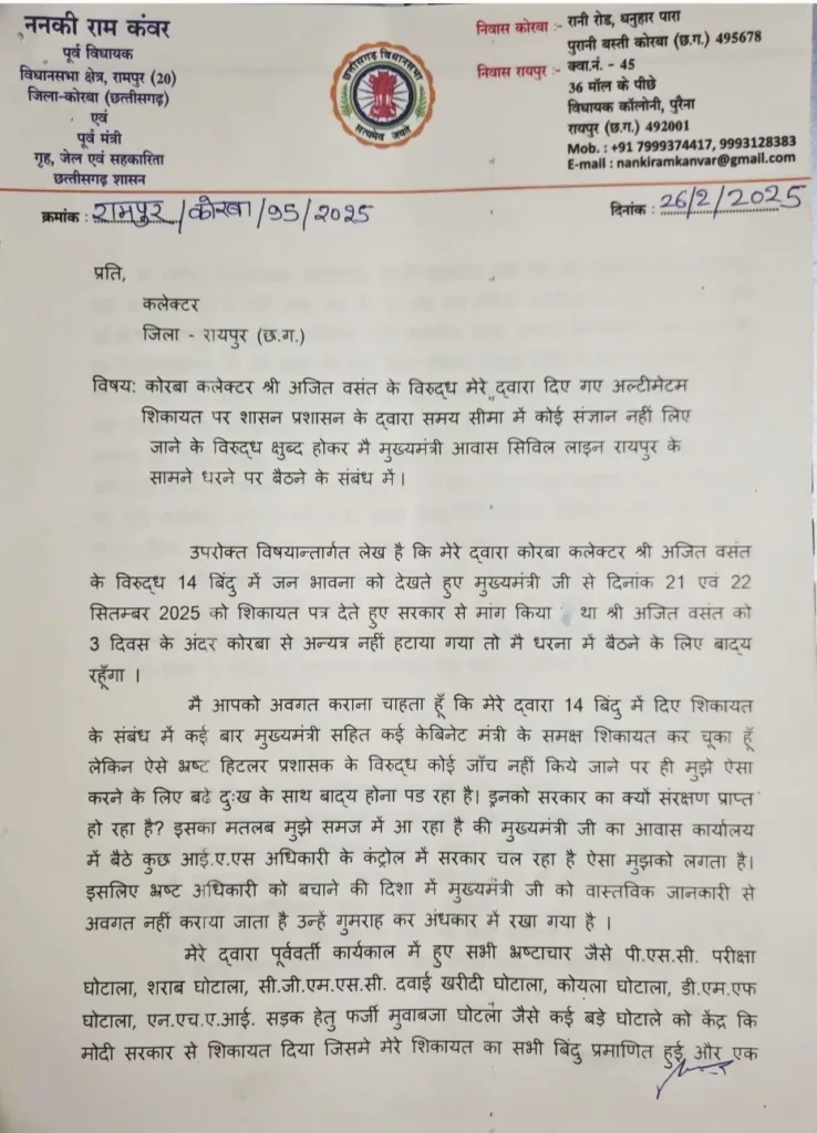 छत्तीसगढ़ के पूर्व गृहमंत्री रहे ननकीराम कंवर ने कोरबा कलेक्टर को लेकर मोर्चा खोल दिया है। 22 सितंबर को उन्होने मुख्यमंत्री के नाम पत्र लिखकर कलेक्टर अजीत वसंत को 3 दिन के भीतर हटाने की मांग की थी। चार पन्नों के इस पत्र में 14 बिंदुओं पर शिकायत करते हुए ननकीराम कंवर ने कलेक्टर अजीत वसंत को हिटलर तक बता दिया था। ननकीराम कंवर का पत्र वायरल होेने के बाद राजनीतिक गहमा-गहमी के बीच ये उम्मींद जतायी जा रही थी कि पार्टी के नेता ननकीराम कंवर को शांत करा लेेंगे। लेकिन ऐसा नही हो सका, लिहाजा 3 दिन का अल्टीमेटम खत्म होने के बाद ननकीराम कंवर ने एक और लेटर बम फोड़ दिया है।