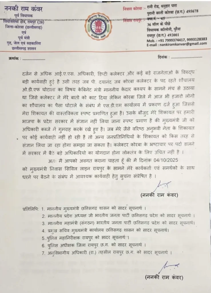 पूर्व गृहमंत्री ननकीराम कंवर ने बढ़ाई सरकार की टेंशन : CM हाउस के सामने बैठेंगे धरने पर, रायपुर कलेक्टर को लिखा पत्र..