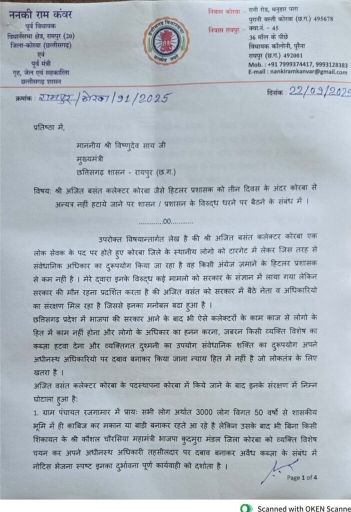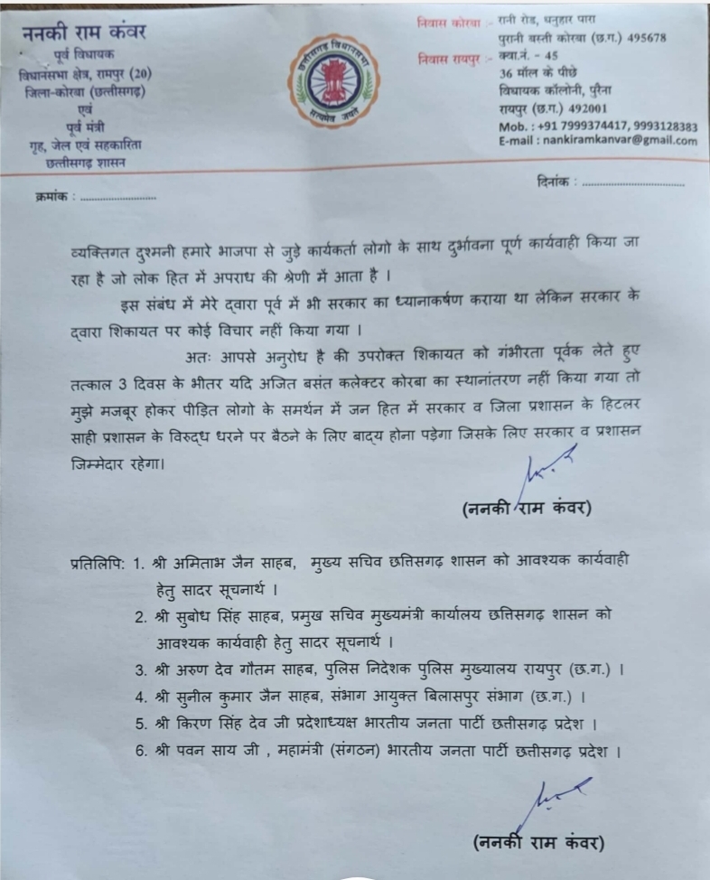 कोरबा// पूर्व गृहमंत्री ननकीराम कंवर कोरबा कलेक्टर अजीत वसंत को हटाने के लिए धरने पर बैठेंगे ! मुख्यमंत्री के नाम लिखे पत्र में ननकीराम कंवर ने कोरबा कलेक्टर को हिटलर बताते हुए तीन दिन के भीतर अन्यत्र तबादला करने की मांग की है। यही नही उन्होने ऐसा नही किये जाने पर शासन-प्रशासन के खिलाफ धरने पर बैठने की भी सीधी चेतावनी दी है। ननकीराम कंवर के इस पत्र के वायरल होने के बाद जहां राजनीति गरमा गयी है, वहीं ब्यूरोक्रेसी और प्रशासनिक अफसरों के बीच चर्चाओं का दौर जारी है।