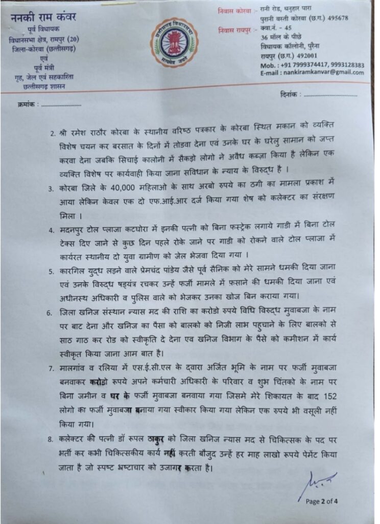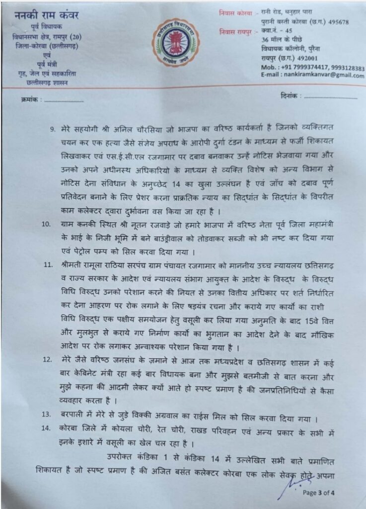उन्होने मुख्यमंत्री विष्णुदेव साय को पत्र लिखकर जहां कोरबा कलेक्टर को हिटलर प्रशासक बता दिया। वहीं उन्होने कलेक्टर द्वारा संवैधानिक अधिकार का दुरूपयोग करने का भी आरोप लगाया है। चार पन्ने के इस पत्र में ननकीराम कंवर ने मुख्यमंत्री से कलेक्टर अजीत वसंत का 3 दिन के भीतर तबादला करने की मांग की है। उन्होने ऐसा नही करने पर शासन-प्रशासन के खिलाफ धरने पर बैठने की चेतावनी दी है। गौरतलब है कि उर्जाधानी के नाम से मशहूर कोरबा जिले में प्रशासनिक अफसरों का कुछ एक राजनेताओं के साथ संबंध कभी भी अच्छा नही रहा है।