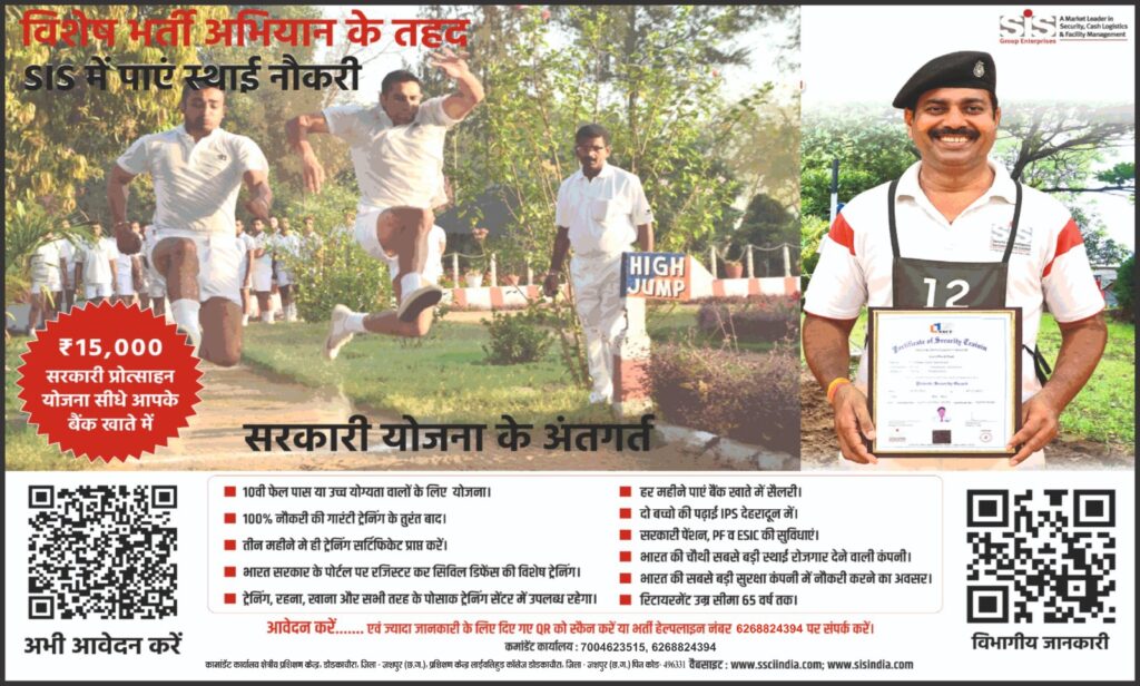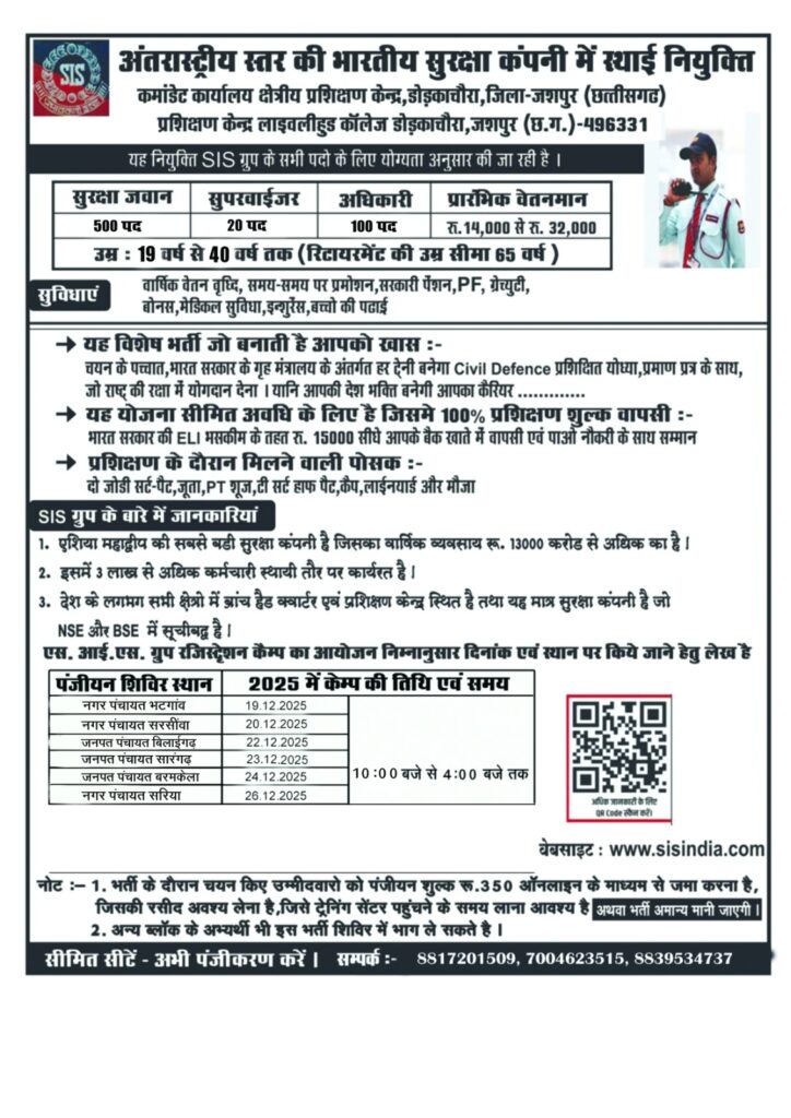 सारंगढ़ बिलाईगढ़// अंतरराष्ट्रीय स्तर पर कार्यरत भारतीय सुरक्षा कंपनी SIS (सिक्योरिटी एंड इंटेलिजेंस सर्विसेज) द्वारा छत्तीसगढ़ में बड़े पैमाने पर भर्ती की जा रही है। इस भर्ती के तहत सुरक्षा जवान, सुपरवाइजर और अधिकारी के कुल 620 पदों पर योग्य युवाओं का चयन किया जाएगा।