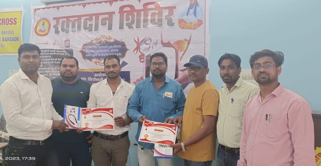 मुंगेली// सरगांव – संत शिरोमणि गुरु रविदास शासकीय महाविद्यालय सरगांव में 24 फरवरी 2023 को नगर पंचायत सरगांव के दिवंगत एल्डरमेन स्व सुनील यादव की मधुर स्मृति में रक्तदान शिविर का आयोजन महाविद्यालय प्रबंधन समिति द्वारा आयोजित किया गया था। कार्यक्रम का शुभारंभ नगर पंचायत सरगांव की पूर्व अध्यक्ष व संत शिरोमणि गुरु रविदास शासकीय महाविद्यालय सरगांव के अध्यक्ष इंदिरा साहू व नगर पंचायत सरगांव के उपाध्याय सुशील यादव , संजय यादव के द्वारा स्व सुनील यादव के छायाचित्र व गुरु रविदास की प्रतिमा पर माल्यार्पण करके हुआ। रक्तदान शिविर में सर्वप्रथम रक्त जिला कराते संघ मुंगेली के कार्यकारी अध्यक्ष राजू निषाद के द्वारा दिया गया इसके बाद महाविद्यालय के विद्यार्थी,पूर्व विद्यार्थी,गोड समाज, सतनामी समाज, सिख समाज, मेहर समाज, मुस्लिम समाज, साहू समाज, ग्राम पंचायत सांवा, ग्राम पंचायत सल्फा, ग्राम पंचायत धमनी, ग्राम पंचायत मोहभट्ठा, जिला कराते संघ मुंगेली, संयुक्त शिक्षक संघ मुंगेली, छत्तीसगढ़ श्रमजीवी पत्रकार संघ मुंगेली व बिल्हा के 72 युवक/युवतियों ने रक्तदान किया। अंतिम में छत्तीसगढ़ श्रमजीवी पत्रकार संघ के राजकुमार यादव , नारायण बंजारे, मनहरण बंजारे, राम भारद्वाज द्वारा रक्तदान किया गया। रक्तदान शिविर का नेतृत्व एकता ब्लड बैंक बिलासपुर के डॉ एसके गिदवानी, धर्मेंद्र राजपूत, महाविद्यालय प्रबंधन समिति के अध्यक्ष इंदिरा साहू, प्राचार्य एसपी अम्बष्ठ, सिंह सर, चंदेल सर, टोप्पो सर, सदस्य मोहन लहरी, विनोद धृतलहरे, दबेश साहू, मनीष यादव, लक्ष्मण कौशिक, असद मोहम्मद, निखिल कौशिक,अमर साहू, ऋषभ हूरा, संयुक्त शिक्षक संघ मुंगेली से बलजीत सिंह कांत, नारायणी कशयप, विद्या शर्मा, प्रवीण कोशले, मोतीलाल अनन्त, प्रिया यादव, सीमा कंवर, शमीम बानो, देव प्रधान, रामशरण कश्यप सहित विभिन्न समाज सेवी उपस्थित रहे।