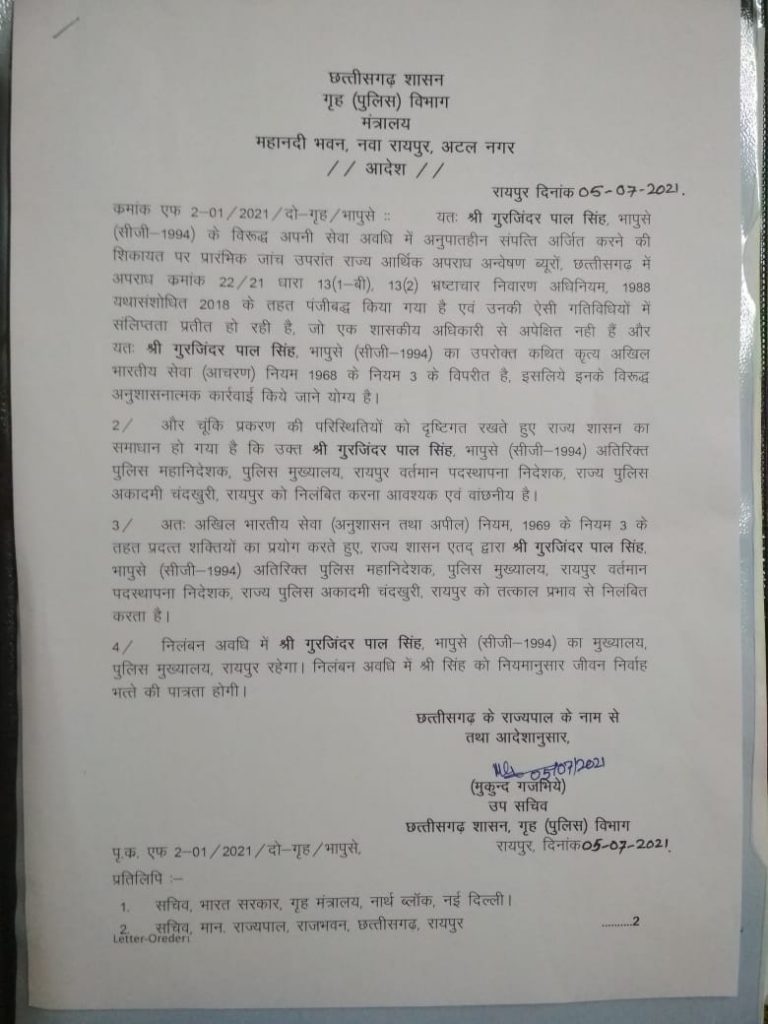 रायपुर// ACB की कार्रवाई के बाद राज्य सरकार ने आईपीएस अफसर जीपी सिंह को निलंबित किया है. बता दें कि 1994 बैच के आईपीएस अधिकारी जीपी सिंह के 15 ठिकानों पर छत्तीसगढ़ एसीबी ने छापेमारी की। जांच के दौरान एसीबी को कई अहम दस्तावेज भी हाथ लगे। जीपी सिंह पर इस वक्त आय से अधिक संपत्ति के आरोप लग रहे हैं, लेकिन उनके नाम कई बड़े विवाद भी दर्ज हैं। गौर करने वाली बात यह भी है कि एसीबी के पूर्व चीफ रह चुके जीपी सिंह की गिनती छत्तीसगढ़ के ताकतवर अफसरों में होती है।