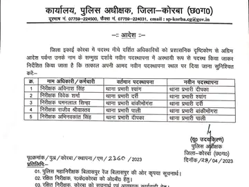कोरबा पुलिस कप्तान ने 5 थाना प्रभारियों का किया तबादला, अविनाश सिंह बने दीपका TI, चमनलाल सिन्हा को दर्री थाने का प्रभार, विवेक शर्मा दर्री से श्यांग थाना ट्रांसफर..