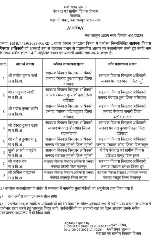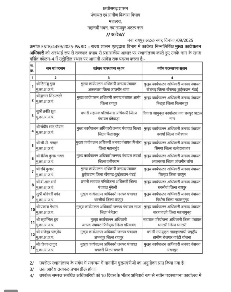 रायपुर// छत्तीसगढ़ सरकार ने पंचायत एवं ग्रामीण विकास विभाग में बड़ी सर्जरी की है। जनपद पंचायतों में पदस्थ मुख्य कार्यपालन अधिकारियों, विकास विस्तार अधिकारी, संयुक्त आयुक्त और सहायक परियोजना अधिकारी व सहायक विकास विस्तार अधिकारियों समेत 40 को इधर से उधर किया गया है।