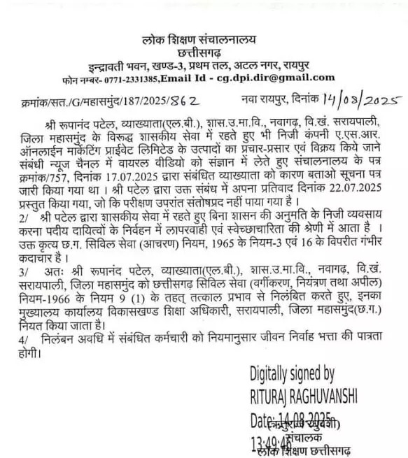 जिसके बाद रूपानंद पटेल व्याख्याता शासकीय उच्चतर माध्यमिक विद्यालय नवागढ़ को डीपीआई ने सस्पेंड करने का आदेश दिया है। उन्हें बीईओ कार्यालय सरायपाली में अटैच किया गया है।